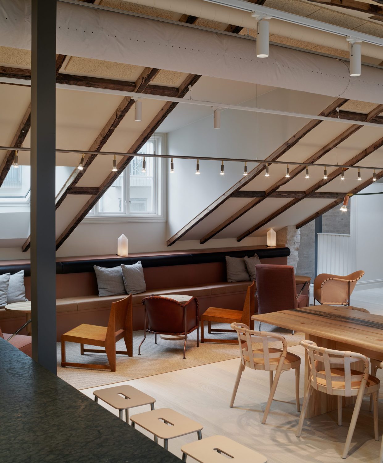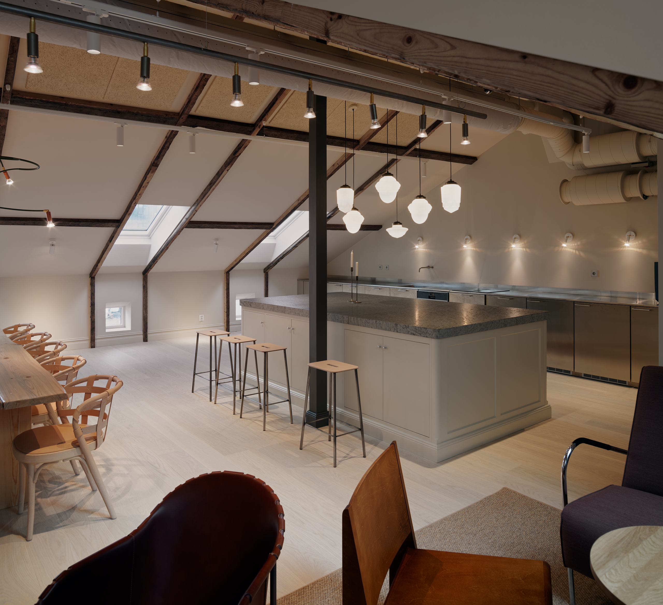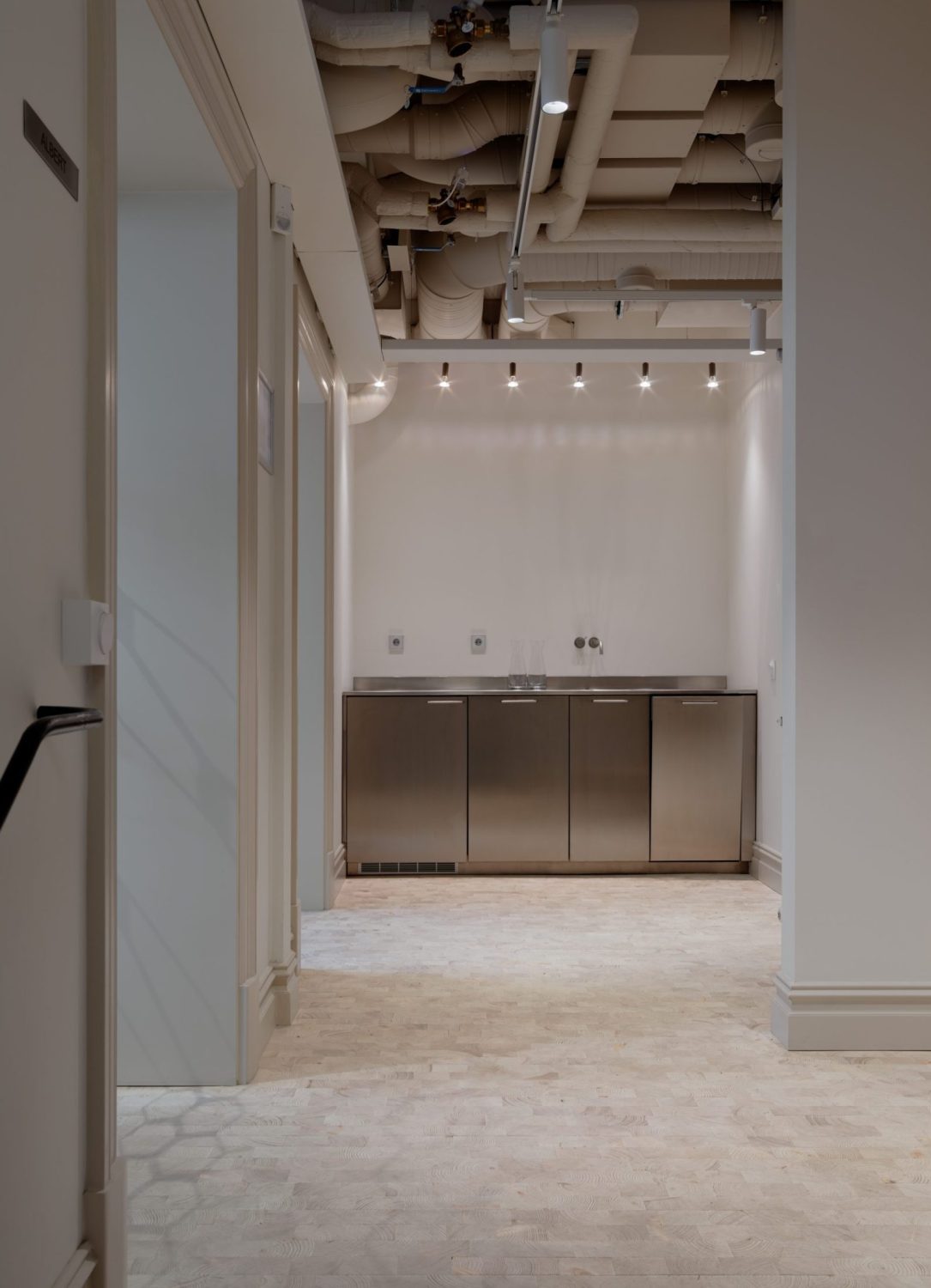 Det gamla lagerhuset har under åren haft växlande användningsområden där varje plan har nyttjats för skilda ändamål. Även i det nya kontoret har de tre våningarna planerats för olika användning och med delvis skild karaktär. Själva entrérummet är utformat som en tydlig övergångszon mellan inne och ute, med inspiration ifrån klostermiljöer och kyrkor. Materialen är slitstarka och här möts det grova och det mer polerade i en stämningsfull känsla. Två halvtrappor sticker ut i entrérummet och bjuder med sina rundade hörn in i byggnaden. Första våningen är ämnad för möten och representation. En våning upp ligger kontoren med en tidlös gestaltning och material som ska hålla över tid. Högst upp finns kontorets vardagsrum, ett stort öppet rum att kunna bjuda in gäster till, mötas och umgås. För att förstärka övervåningen som den självklara mötesplatsen har inga pentryn eller kaffestationer placerats ut på kontorsvåningen.
