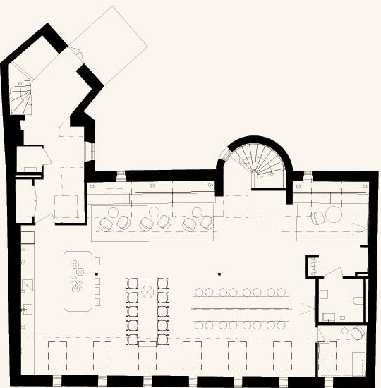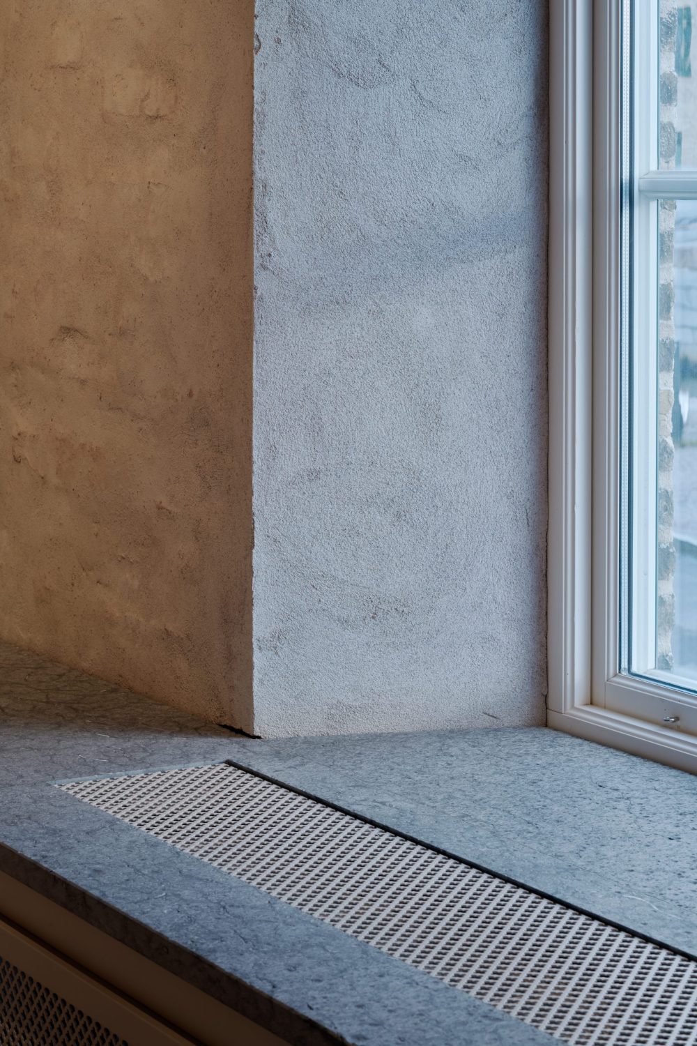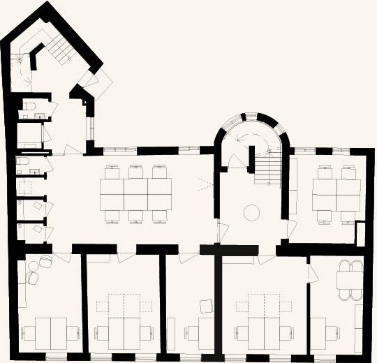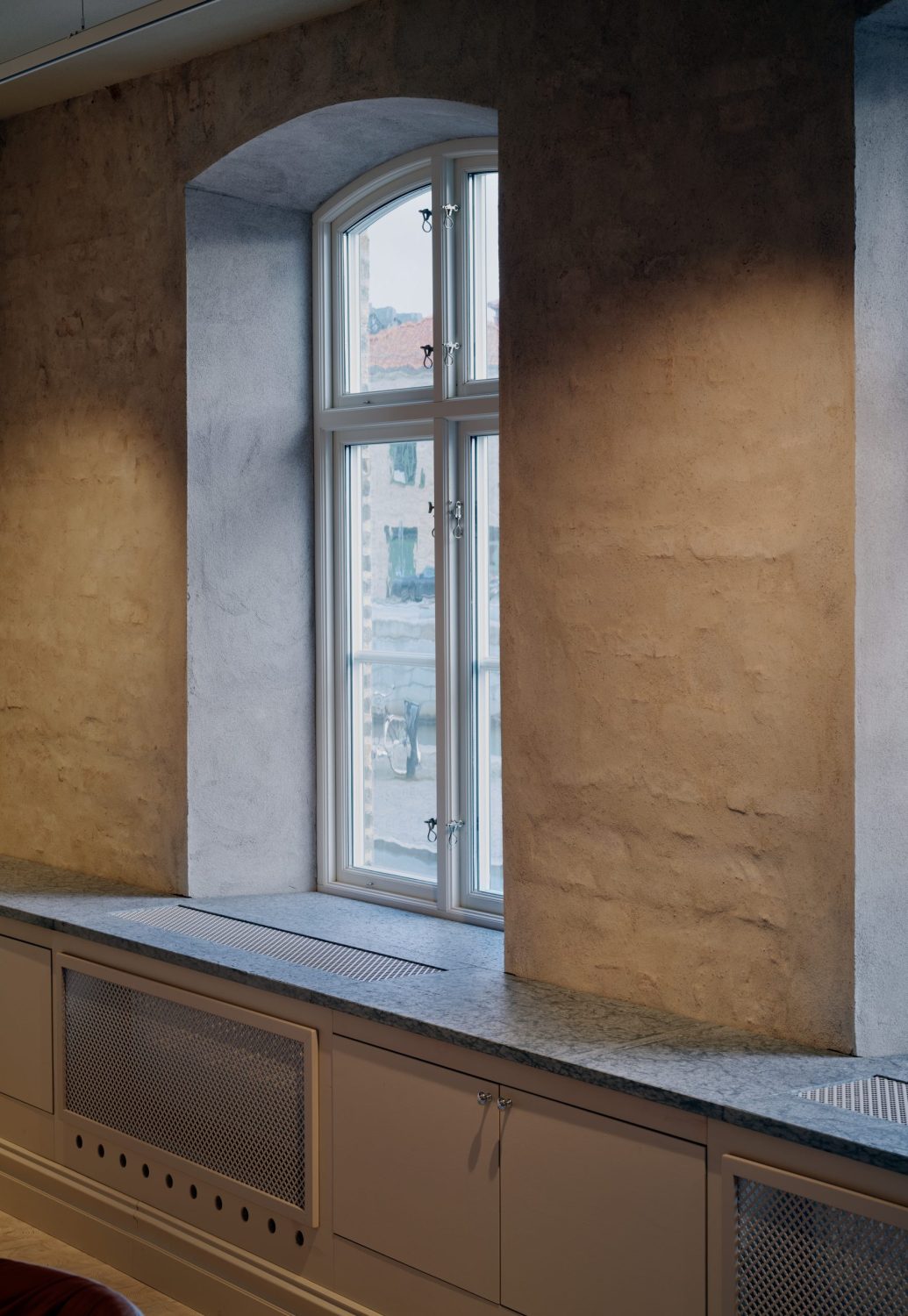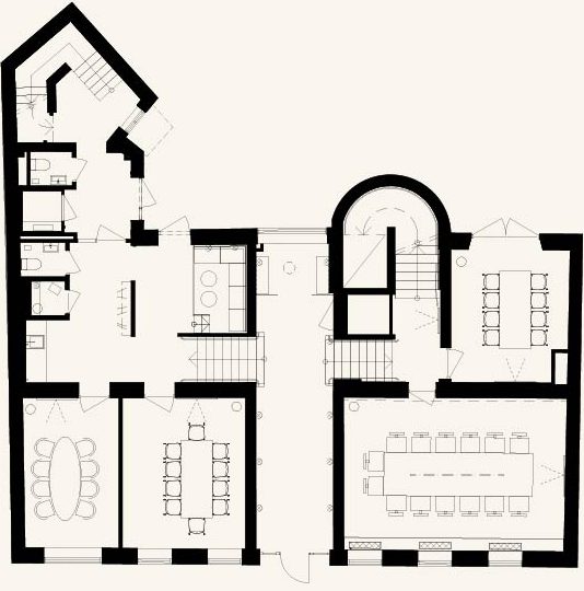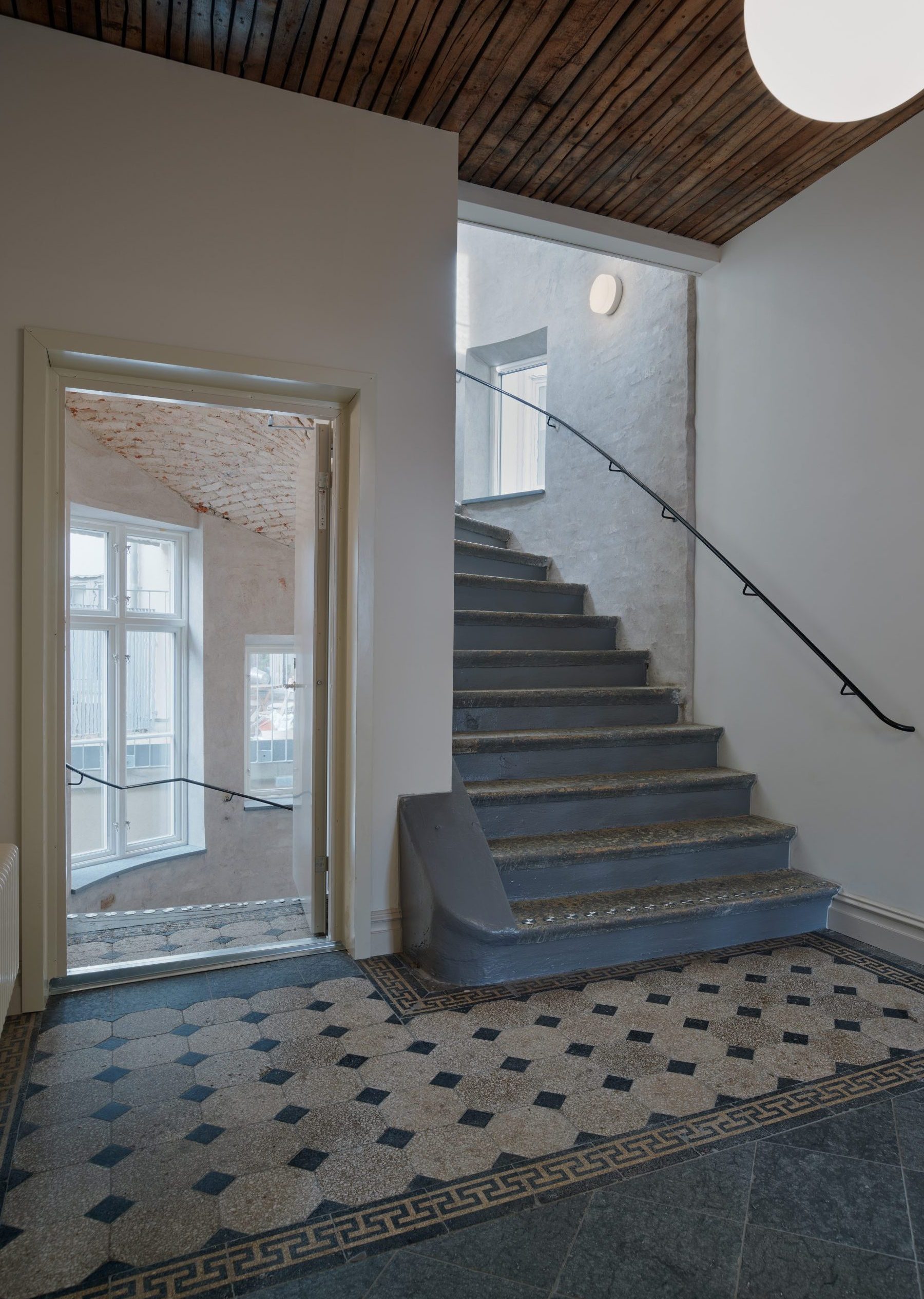Det gamla lagerhuset har under åren haft växlande användningsområden där varje plan har nyttjats för skilda ändamål. Även i det nya kontoret har de tre våningarna planerats för olika användning och med delvis skild karaktär. Själva entrérummet är utformat som en tydlig övergångszon mellan inne och ute, med inspiration ifrån klostermiljöer och kyrkor. Materialen är slitstarka och här möts det grova och det mer polerade i en stämningsfull känsla. Två halvtrappor sticker ut i entrérummet och bjuder med sina rundade hörn in i byggnaden. Första våningen är ämnad för möten och representation. En våning upp ligger kontoren med en tidlös gestaltning och material som ska hålla över tid. Högst upp finns kontorets vardagsrum, ett stort öppet rum att kunna bjuda in gäster till, mötas och umgås. För att förstärka övervåningen som den självklara mötesplatsen har inga pentryn eller kaffestationer placerats ut på kontorsvåningen.