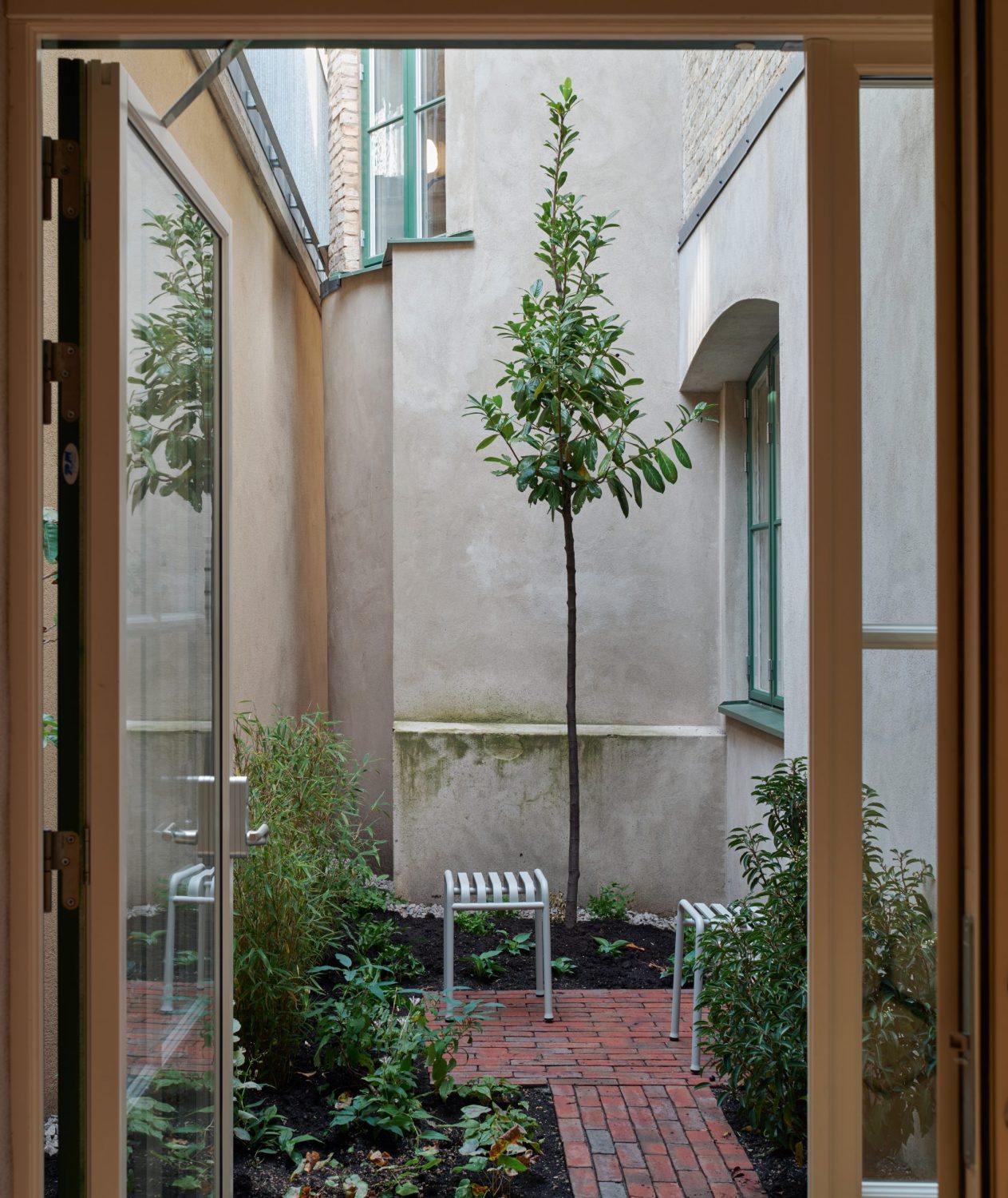 De två små innergårdarna är inte primärt utformade för vistelse. De är gestaltade med inspiration från japanska trädgårdar, med en avskalad estetik och tänkta att bidra till lugn med hjälp av växtlighet. Trots sina ringa storlekar är innergårdarna viktiga och närvarande genom hela byggnaden, inte minst vid rörelse i de två bevarade trapphusen.