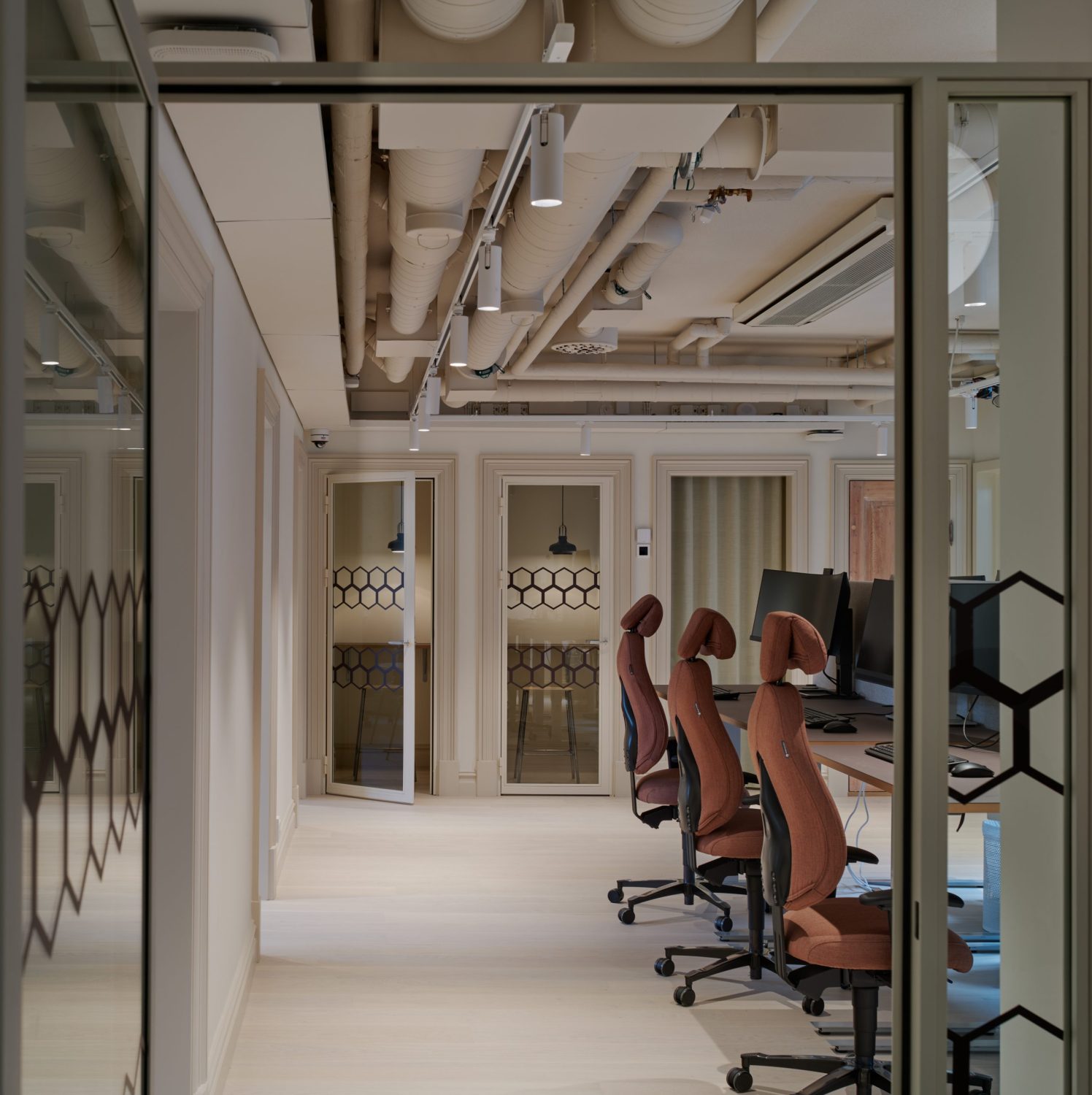 I det anrika kvarteret Röda bryggan vid Järntorget ligger Brogatan 2. Byggnaden från 1859 har de senaste åren varsamt renoverats. Inobi fick förtroendet att rita om huset till ett funktionellt kontor i tre plan, samt uppdraget att ta fram ett inredningskoncept och implementera detta för all inredning i huset. Sedan augusti 2025 står helheten klar. När vi besökte Brogatan 2 för första gången var byggnaden tom. Rummen i dess avskalade form bar på mycket historia och gav ett alldeles särskilt intryck. Det stod klart för oss efter det första besöket att bevarande av rumsligheter och rörelser däremellan skulle stå primärt i fokus.