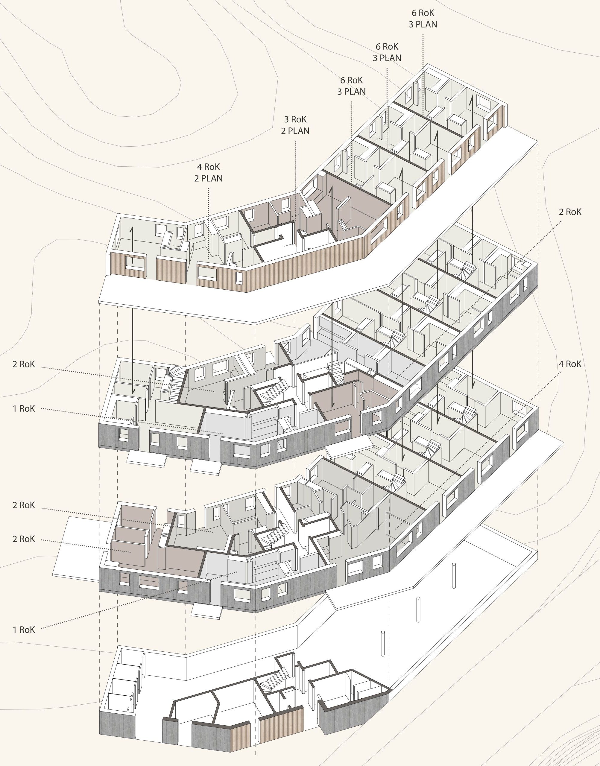 Byggnaden består av en källarvåning med parkeringsgarage följt av två fulla våningsplan med lägenheter. Överst i byggnaden finns en indragen takvåning med stora takterrasser mot väst.