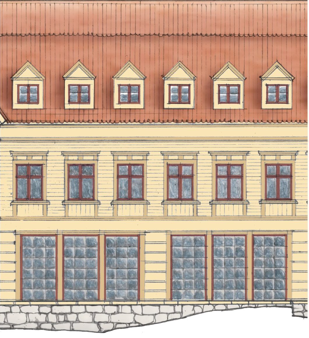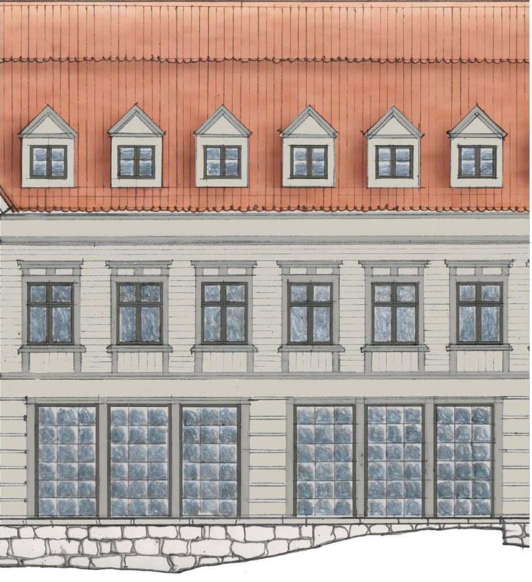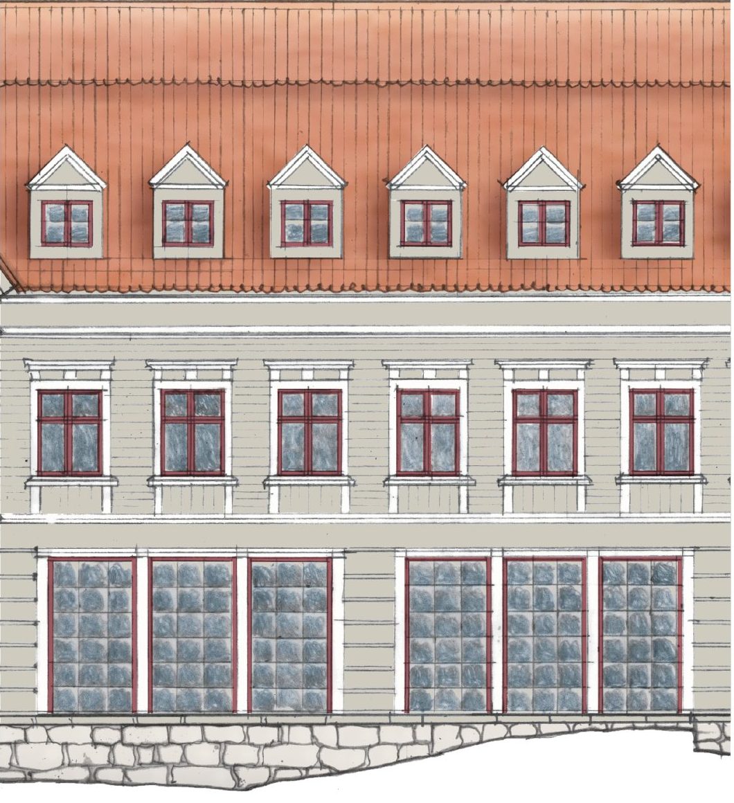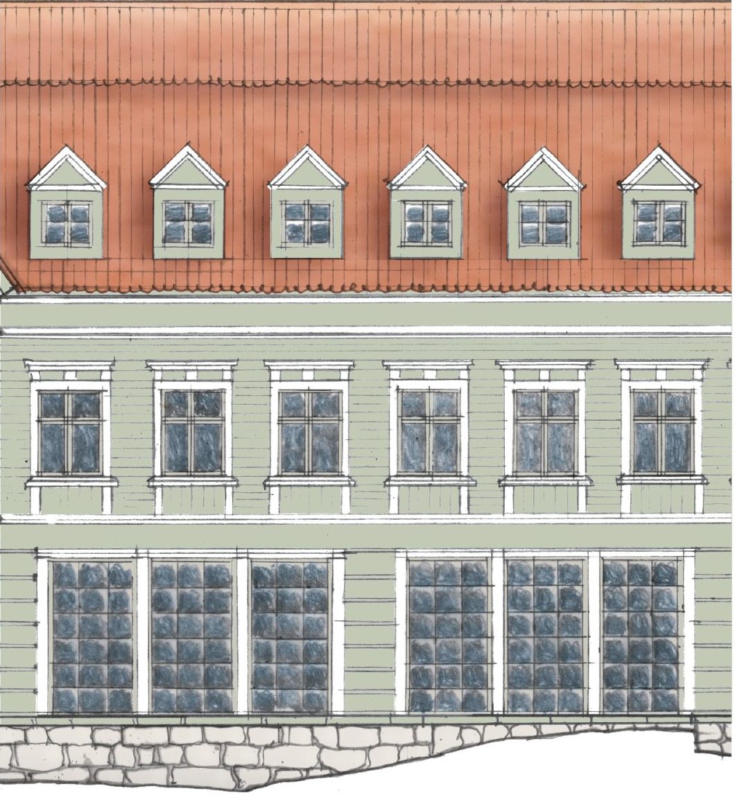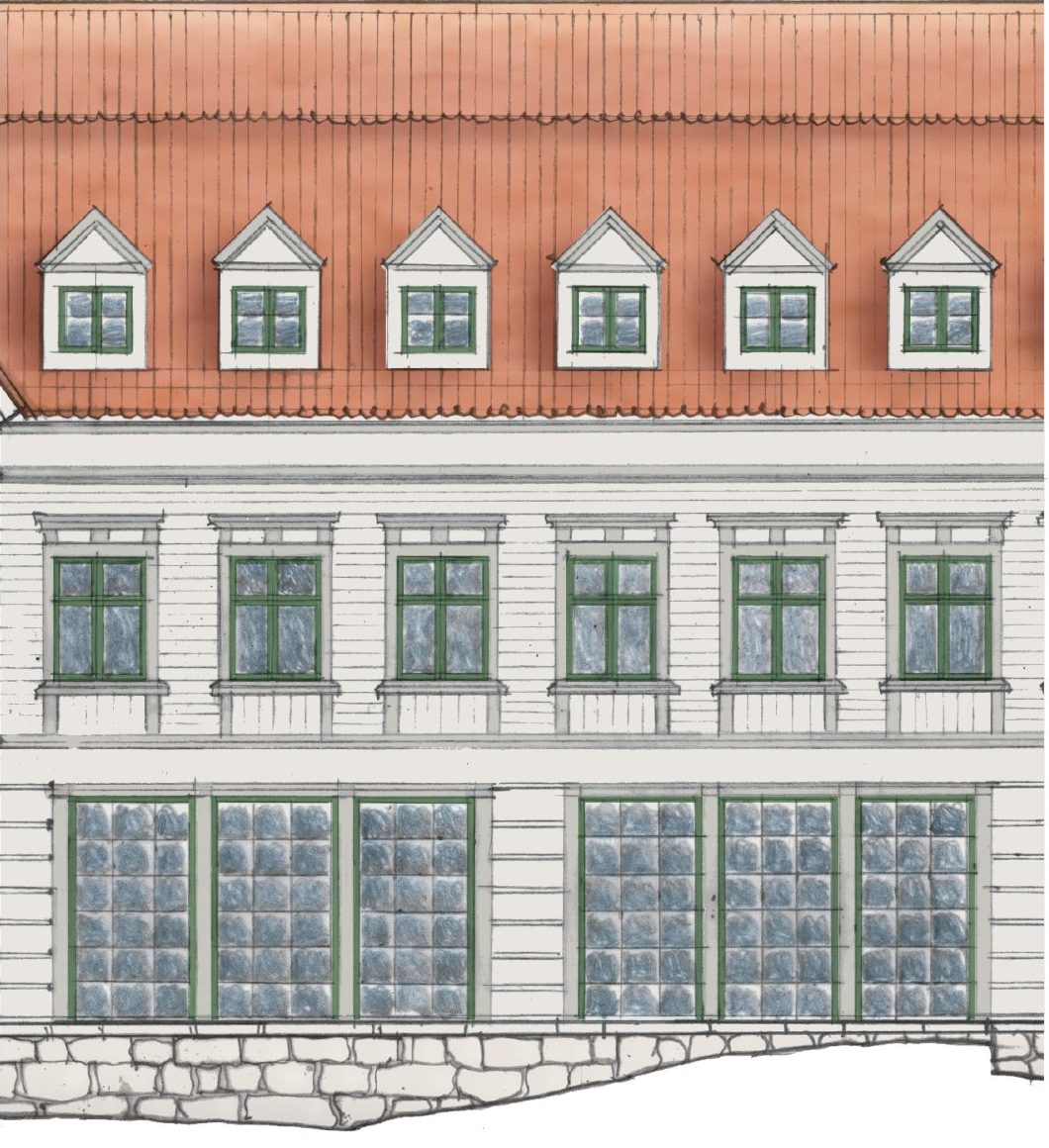 Kulören är en viktig del av byggnadens uttryck - den skall vara grundad i bohuslänsk byggtradition. På perspektiven redovisas en ljusgrå hotellbyggnad med vita foder och karmar, men i arbetet med hotellet har vi utforskat en palett av möjliga kulörer, några som ni kan se i skisserna här ovanför.