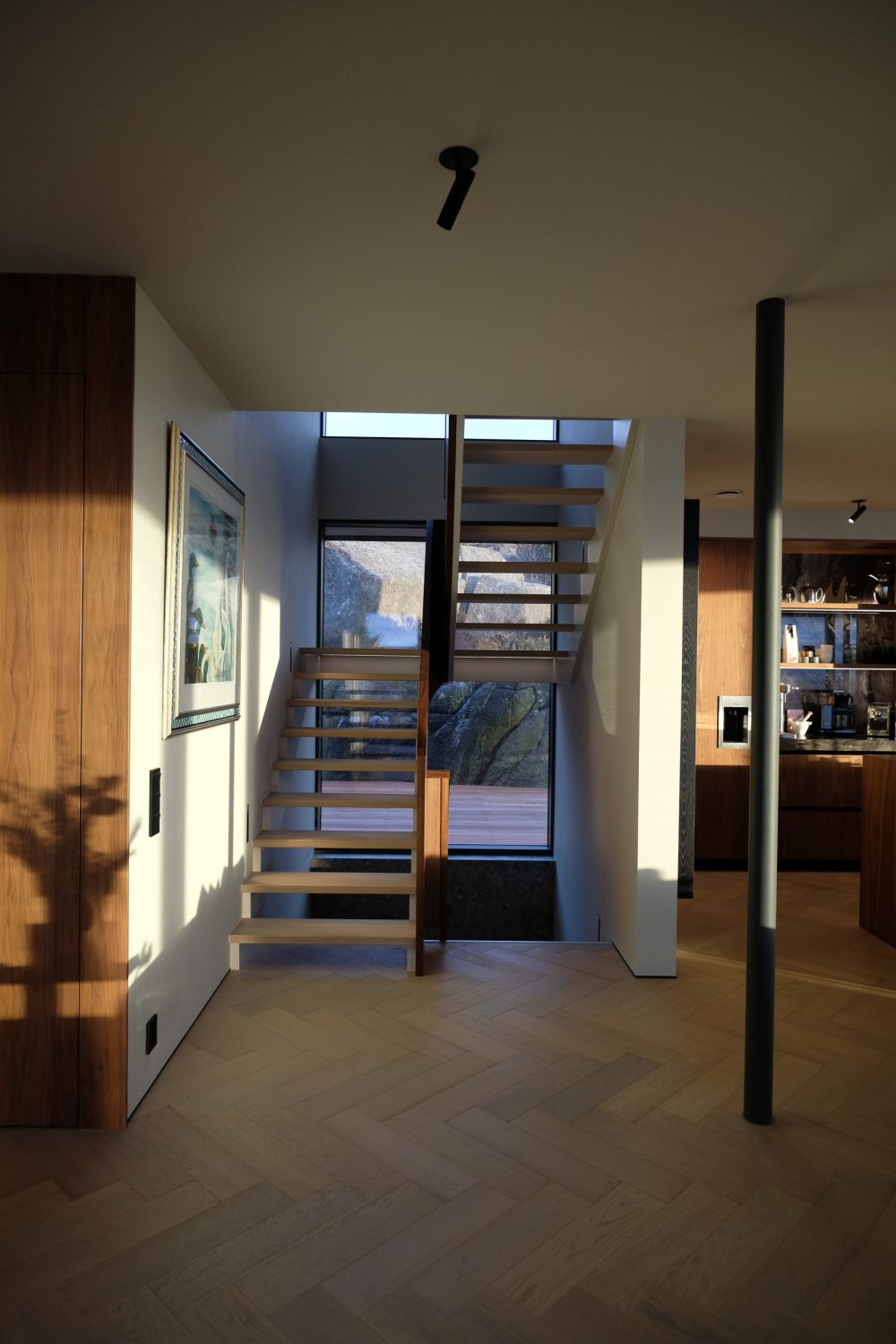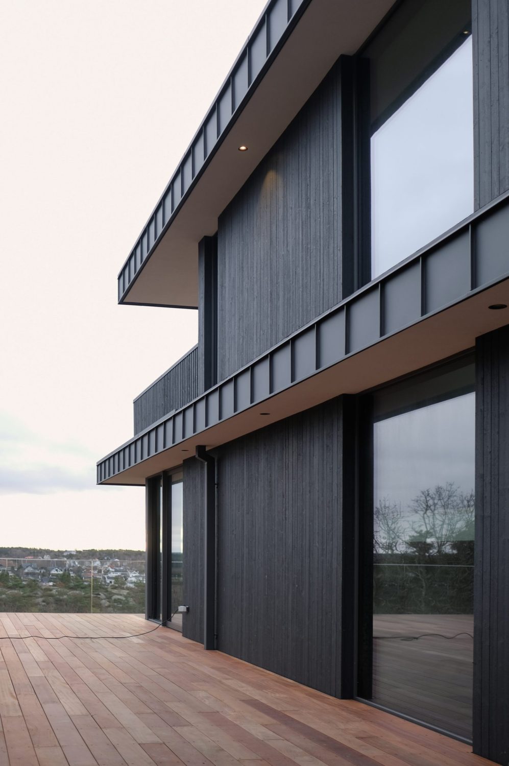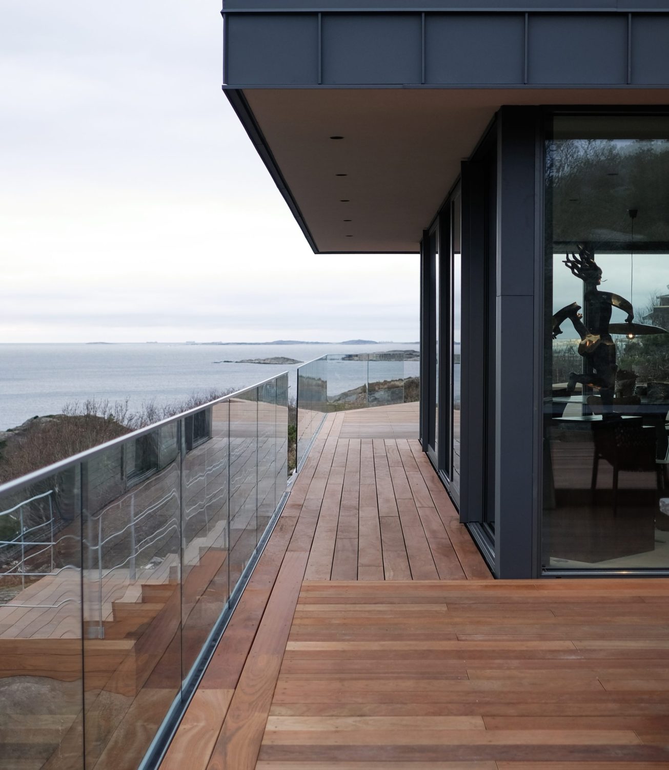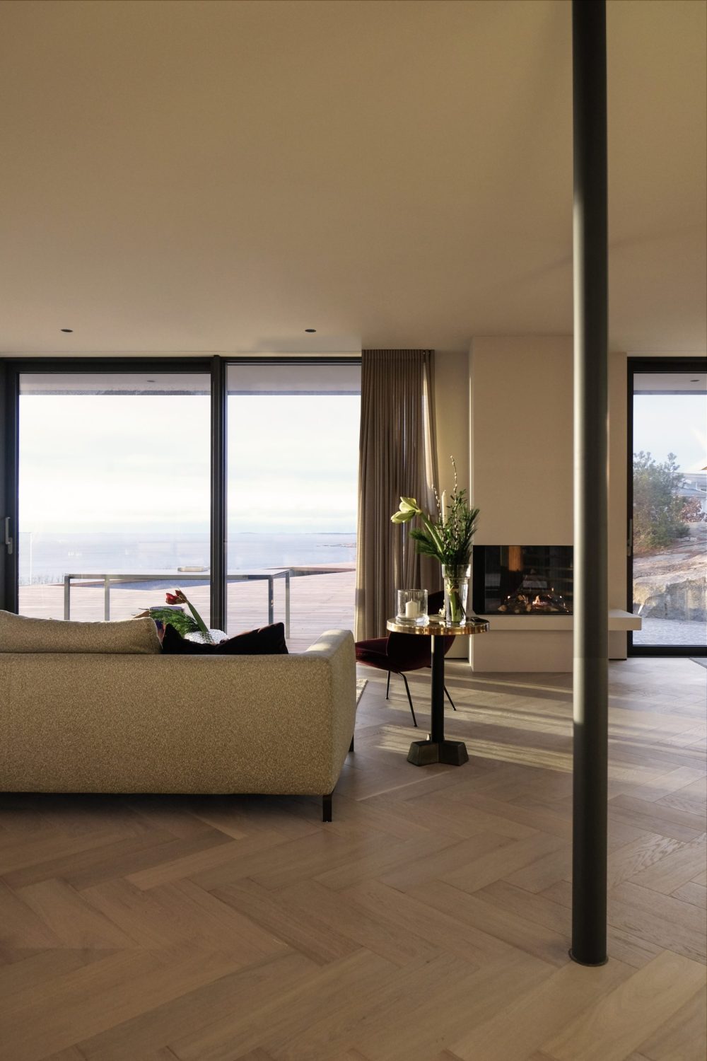 De generösa glaspartierna skapar en stark visuell och rumslig koppling mellan interiör och omgivande landskap, samtidigt som dagsljuset når långt in i bostaden. Räckena på fasaden är gjorda i glas för att frigöra utsikten mot havet och bryta upp känslan av ute och inne. De kraftigt utskjutande taken skärmar av solens starkaste strålar under sommarens varma dagar medan den lägre solen tillåts lysa in i bostaden på kvällar och under vintertid.