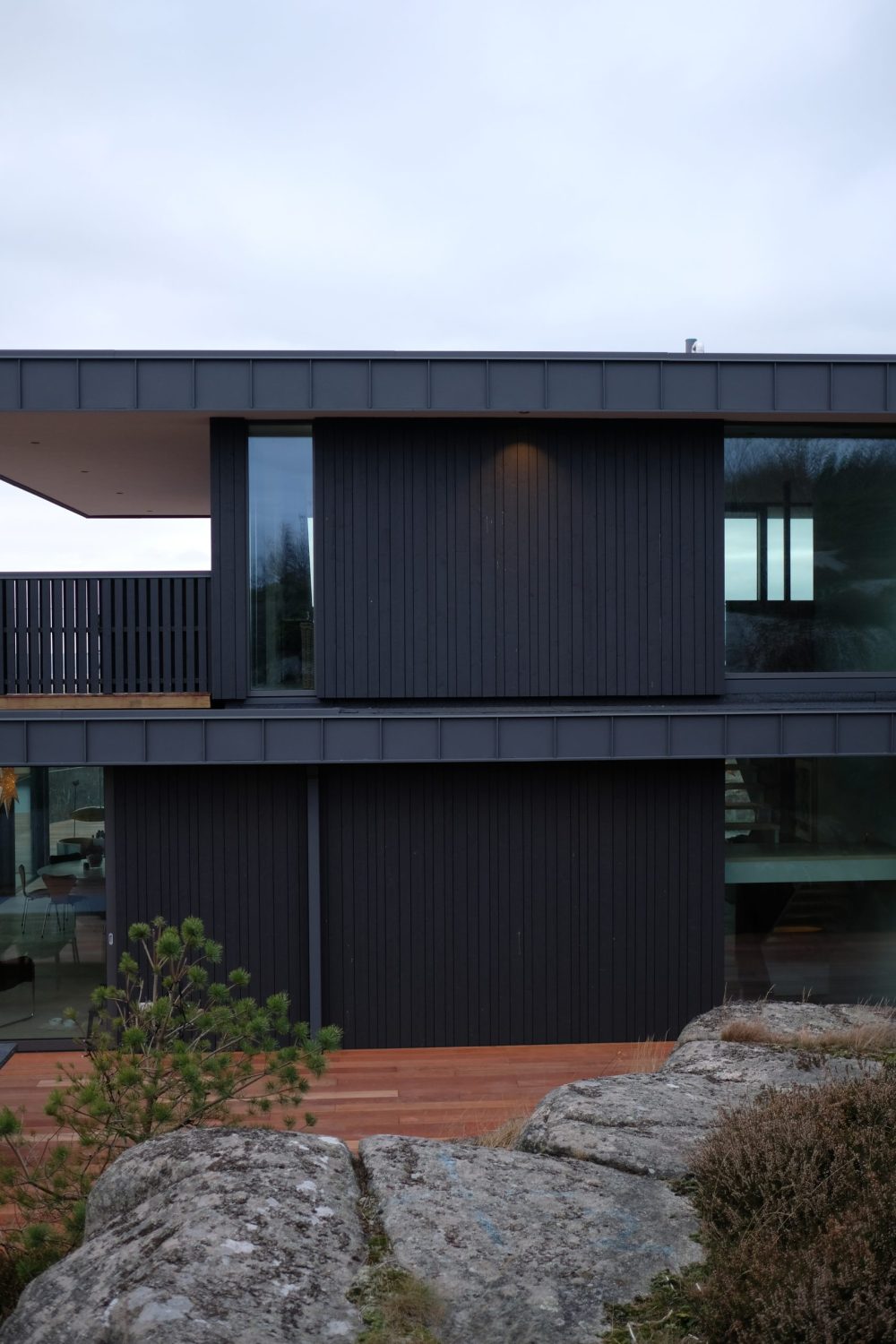 Det befintliga 80-tals huset bestod av en suterrängvåning och ett entréplan. Suterrängvåningen genomgick en omfattande renovering där stora glaspartier sattes in i de delar som låg fria från mark. Entréplanet byggdes om och ytterligare en våning byggdes på. På det nya entréplanet placerades kök och vardagsrum i en öppen planlösning med sociala ytor och generöst ljusinsläpp. Översta våningen rymmer ett master bedroom med eget badrum, en walk-in-closet och en stor takterrass med utsikt över skärgården.